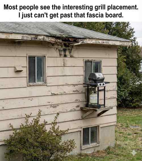 Redneck meme with a grill attached to a bedroom window and rotten fascia board!This example is from a very common meme that I have seen quite a bit. However, I now have a roofer whose social media I manage, so I saw this from a different perspective. I recently wrote a blog article about soffit and fascia for him, so when I saw this meme, guess what caught my attention? Right. Browsing through all those roofing images and pictures of fascia suddenly paid off in a different way.